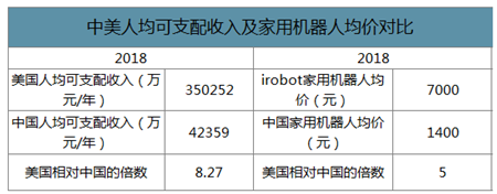 2018年美國人均可支配收入折算成人民幣約為35萬元,而我國城鎮(zhèn)人口人均可支配收入約為4.2萬元,美國是中國的8.27倍;美國irobot家用機器人均價可能在7000元以上,而中國家用機器人均價僅為1400元左右,由于irobot在美國的市占率高達88%,則美國家用機器人均價是我國的5倍。展望未來五年,由于我國人均可支配收入仍有望維持快速增長,與美國的差距持續(xù)縮小,且家用機器人目前最低價已經(jīng)為1000元左右,美國市場的滲透度對我國家用機器人的發(fā)展參考性。