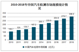 為了保障交通安全和保護(hù)環(huán)境,近年來(lái)公安部、環(huán)保部等監(jiān)管部門持續(xù)加強(qiáng)汽車檢測(cè)力度,拉動(dòng)中國(guó)汽車檢測(cè)市場(chǎng)快速發(fā)展。2010年我國(guó)汽車檢測(cè)市場(chǎng)規(guī)模已達(dá)109.7億元,并呈現(xiàn)逐年增長(zhǎng)態(tài)勢(shì),進(jìn)入2018年底我國(guó)汽車檢測(cè)市場(chǎng)規(guī)模達(dá)到了306.5億元,2010-2018年復(fù)合增長(zhǎng)率達(dá)到13.70%
