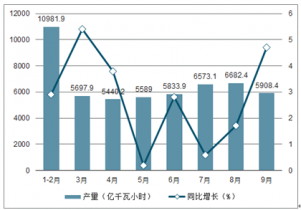 2019年1-9月全國發(fā)電量有所增長,增長14.89%。2019年9月全國發(fā)電量為5908.4億千瓦時,同比增長4.7%。2019年1-9月全國發(fā)電量為52967.3億千瓦時,同比增長3%。