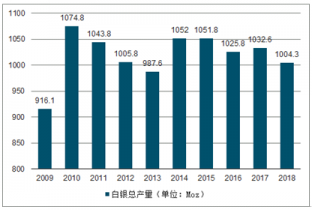 2009-2018年全球白銀總產(chǎn)量(單位:Moz)