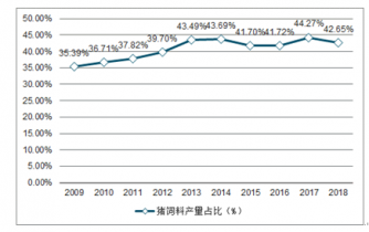 2018年豬飼料產(chǎn)量占商品飼料總產(chǎn)量的42.65%