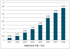 近年來,國內(nèi)超級活性炭企業(yè)產(chǎn)能有所擴張,生產(chǎn)技術(shù)也逐步成熟,國內(nèi)超級活性炭產(chǎn)量迅速增長。2018年我國超級活性炭產(chǎn)量達到4.31萬噸,相比于2011年的0.28萬噸增長了15倍。