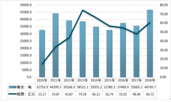 2010-2018年我國人參需求量及市場規(guī)模走勢
