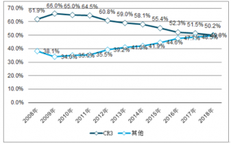 2008-2018年中國運動服裝行業(yè)CR3變化