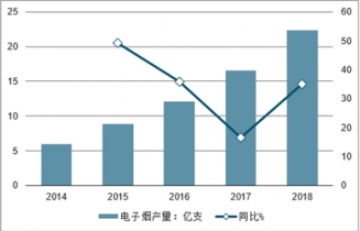 2014-2018年中國(guó)電子煙產(chǎn)量及同比增長(zhǎng)走勢(shì)