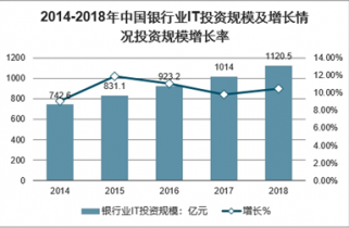2014-2018年中國銀行業(yè)IT投資規(guī)模及增長情況投資規(guī)模增長率(億元、%)