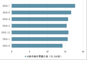 2019年7月份,36城市豬肉零售價(jià)格為17.79元/斤,同比增長(zhǎng)22.8%,環(huán)比增長(zhǎng)6.7%。