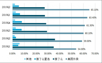 2019年第二季度美團外賣的市場份額為65.1%,較去年同期增長近6個百分點,餓了么的市場份額則萎縮至不足3成。