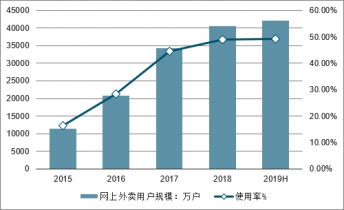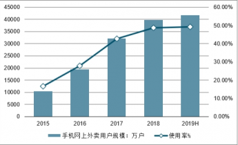 2015-2019年上半年中國手機網上外賣用戶規模及使用率情況