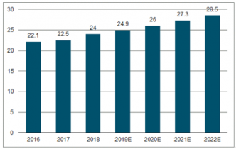 2018年全球乘用車總銷量為5700 萬輛,銷售額為1.3萬億美元,2022 年市場規模預計將達到1.5萬億美元。