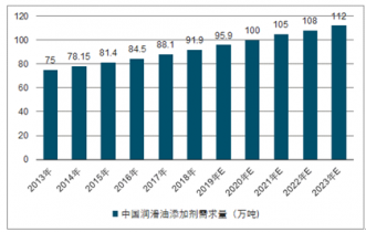 作為全球最大的潤(rùn)滑油消費(fèi)國(guó)之一,我國(guó)潤(rùn)滑油添加劑的需求量由2013年的75萬(wàn)噸增長(zhǎng)到2018年的91.9萬(wàn)噸,年均增長(zhǎng)率為4.2%。隨著我國(guó)機(jī)動(dòng)車市場(chǎng)的持續(xù)增長(zhǎng)及工業(yè)化進(jìn)程加快,預(yù)計(jì)國(guó)內(nèi)潤(rùn)滑油添加劑市場(chǎng)的需求將繼續(xù)保持較高的增長(zhǎng)率。至2023年,我國(guó)潤(rùn)滑油添加劑需求量將增長(zhǎng)至112萬(wàn)噸。