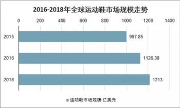 2016年全球運(yùn)動(dòng)鞋市場(chǎng)規(guī)模已達(dá)到1126.38億美元,同比增長(zhǎng)12.88%,遠(yuǎn)高于同期運(yùn)動(dòng)鞋服市場(chǎng)增速;2018年達(dá)到1213億美元左右。