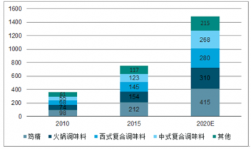 中國(guó)復(fù)合調(diào)味品行業(yè)的規(guī)模于2015年達(dá)到751億元,其中雞精、火鍋底料、西式復(fù)合、中式復(fù)合分別占比 28.2%、20.5%、19.3%、16.4%,并且預(yù)計(jì)2020 年規(guī)模達(dá)到1,488億元。