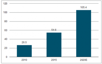2015年美國(guó)與日本的年度人均復(fù)合調(diào)味品支出分別為83.3美金和85.3美金,而中國(guó)2015年僅為8.8美金或54.6元,預(yù)計(jì)這一數(shù)值于 2020年將會(huì)達(dá)到105.4元,實(shí)現(xiàn) CAGR 14.06%。