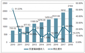 2010-2018年中國汽車變速箱行業(yè)銷售收入及增長