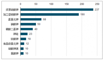 2018年,資源硫酸鉀產(chǎn)量為237萬噸,加工型硫酸鉀產(chǎn)量為190萬噸,氫氯化鉀產(chǎn)量為68萬噸,在鉀肥總產(chǎn)量中分別占比25.85%、20.72%以及7.42%;分別排位第.一、二、三。