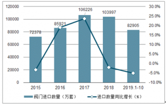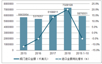 2019年1-10月中國閥門進口數(shù)量為82905萬套,同比下降5%;2019年1-10月中國閥門進口金額為5876551千美元,同比下降5%。