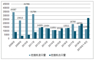 2018年中國挖掘機進口16755臺,同比下降10.78%;2018年中國挖掘機出口19100臺,比2017年增長97.5%。2019年1-9月挖掘機進口12306臺;出口26814臺。國外市場空間較大,高性價比的國內(nèi)品牌也越來越受到國外市場的青睞,隨著品牌知名度的提升及國外市場的開拓,挖機出口銷量未來將有望獲得一定的提升。