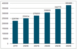 2018年納入統(tǒng)計的25家主機制造企業(yè),共計銷售各類挖掘機械產品203420臺,同比漲幅45.0%,2019年1-9月份累計銷售179195臺,同比增長14.7%。2009-2018年我國挖掘機銷量復合增速為7.9%,結合2019年前三季度增長情況,預測2019-2024年中國挖掘機銷量復合增速將在11%左右,預計到2024年我國挖掘機銷量將超過38萬臺。
