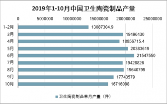 2019年10月中國衛(wèi)生陶瓷制品產(chǎn)量為16716098件,同比增長5.6%;2019年1-10月中國衛(wèi)生陶瓷制品產(chǎn)量為181354223件,同比增長12.3%。
