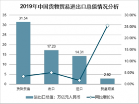 2019年,我國(guó)貨物貿(mào)易進(jìn)出口總值31.54萬億元人民幣,比2018年增長(zhǎng)3.4%。其中,出口17.23萬億元,增長(zhǎng)5%;進(jìn)口14.31萬億元,增長(zhǎng)1.6%;貿(mào)易順差2.92萬億元,擴(kuò)大25.4%。