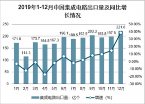 2019年11月中國(guó)集成電路出口量為197.8億個(gè),2019年12月中國(guó)集成電路出口量為221.8億個(gè),同比增長(zhǎng)38.5%。