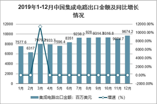 2019年1-12月中國(guó)集成電路出口金額及同比增長(zhǎng)情況