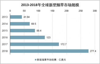 近年來,隨著國際上對(duì)卷煙管控措施的加強(qiáng),181個(gè)國家和地區(qū)加入《世界衛(wèi)生組織煙草控制框架公約》,加強(qiáng)對(duì)吸煙的管控,而新興煙草作為傳統(tǒng)香煙的替代品,有著較低的尼古丁和細(xì)胞毒性,得到了良好發(fā)展。2018年全球新型煙草市場(chǎng)規(guī)模達(dá)到277.4億美元,同比增長(zhǎng)60.6%,2013-2018年CAGR達(dá)到45.9%。