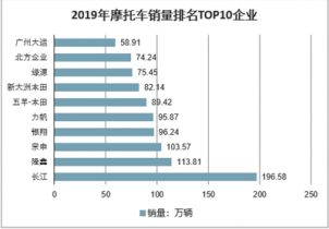 2019年,銷量排名前十位的企業(yè)為大長江、隆鑫、宗申、銀翔、力帆、五羊-本田、新大洲本田、綠源、北方企業(yè)、廣州大運(yùn),分別銷售196.58萬輛、113.81萬輛、103.57萬輛、96.24萬輛、95.87萬輛、89.42萬輛、82.14萬輛、75.45萬輛、74.24萬輛、58.91萬輛。與上年相比,除綠源外,有隆鑫、宗申、五羊-本田、新大洲本田4家企業(yè)增長,其他5家企業(yè)呈不同程度下降。2019年,前十家企業(yè)累計(jì)銷售摩托車986.24萬輛,占摩托車總銷量的57.57%。