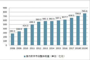 2008 年-2019 年國內(nèi)軟件市場整體規(guī)模(單位:億元)
