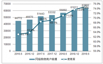 2016-2019年上半年網(wǎng)絡(luò)購物用戶規(guī)模及使用率