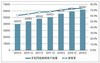 2016-2019年上半年手機(jī)網(wǎng)絡(luò)購物用戶規(guī)模及使用率