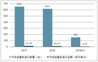 根據(jù)數(shù)據(jù),2017和2018年供裝于公路車輛的其他起重機(jī)進(jìn)口數(shù)量分別為651臺和615臺,進(jìn)口金額分別達(dá)到1178.08萬美元和1012.98萬美元;截至2019年上半年,供裝于公路車輛的其他起重機(jī)進(jìn)口數(shù)量151臺,進(jìn)口金額為311.74萬美元。