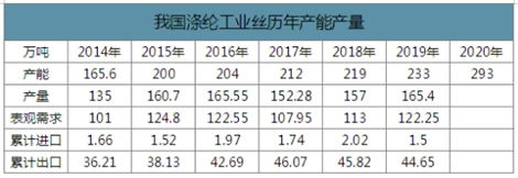 圖表:2015-2019年我國滌綸工業(yè)絲產(chǎn)能統(tǒng)計表