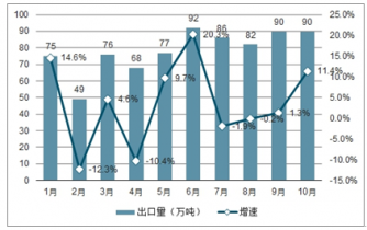 2019年1-10月我國(guó)蔬菜出口量及增速趨勢(shì)