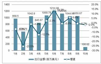 2019年1-10月我國(guó)蔬菜出口金額及增速趨勢(shì)