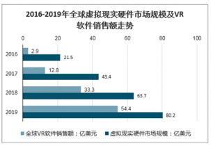 2016-2019年全球虛擬現實硬件市場規(guī)模及VR軟件銷售額走勢