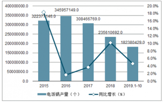 2015-2019年1-10月中國電飯鍋產(chǎn)量及增速趨勢圖