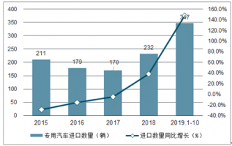 2015-2019年1-10月中國(guó)專用汽車進(jìn)口數(shù)量及增速趨勢(shì)圖