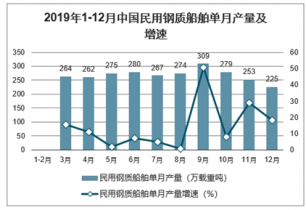 2019年12月中國(guó)民用鋼質(zhì)船舶產(chǎn)量為225萬載重噸,同比增長(zhǎng)18.1%。