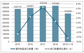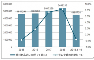 2019年1-10月中國塑料制品進口數(shù)量為372028噸,同比下降6.4%;2019年1-10月中國塑料制品進口金額為4485738千美元,同比下降1.6%。