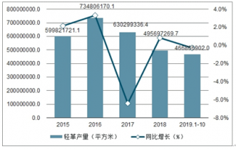 2015-2019年1-10月中國輕革產(chǎn)量及增速趨勢圖