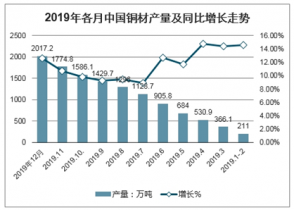 2019年各月中國(guó)銅材產(chǎn)量及同比增長(zhǎng)走勢(shì)
