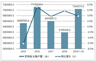 2019年10月中國家用電冰箱產(chǎn)量為7045574臺,同比增長3%;2019年1-10月中國家用電冰箱產(chǎn)量為71108909臺,同比增長3.8%。