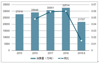 2015-2019年8月我國成品油(汽柴煤)表現(xiàn)消費量趨勢