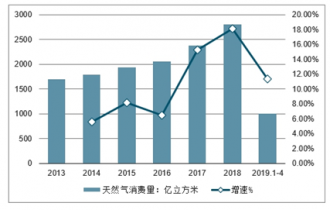2013-2019年中國天然氣消費量及同比增長走勢