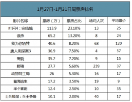 截至1月31日,《葉問4:完結篇》本周113.9萬奪得榜首;《誤殺》本周票房65.2萬奪下亞軍;《我為你犧牲》本周票房40.6萬奪得第三名。