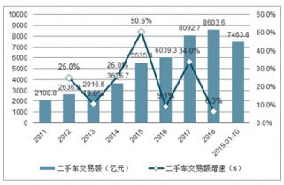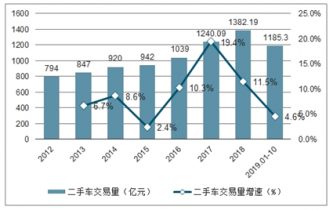 2011-2019年前10月中國二手車交易額統(tǒng)計及增長情況