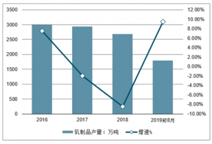 20162019年前8月中國(guó)乳制品產(chǎn)量及增長(zhǎng)情況