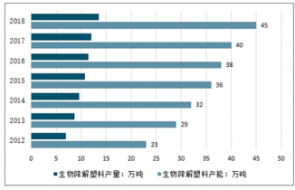 2012-2018年中國(guó)生物降解塑料產(chǎn)能及產(chǎn)量走勢(shì)